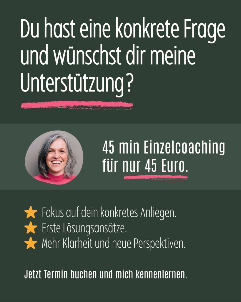 Ab sofort biete ich ein 45 Minuten Online-Coaching für nur 45 Euro zu ausgewählten Terminen an.