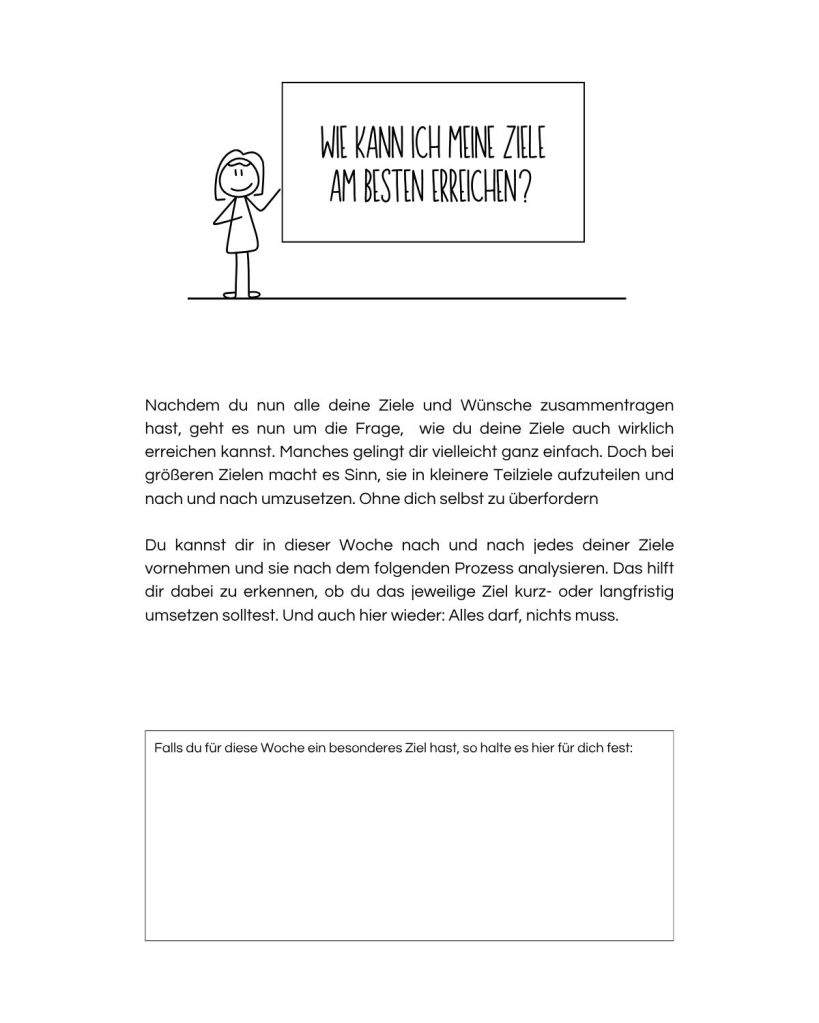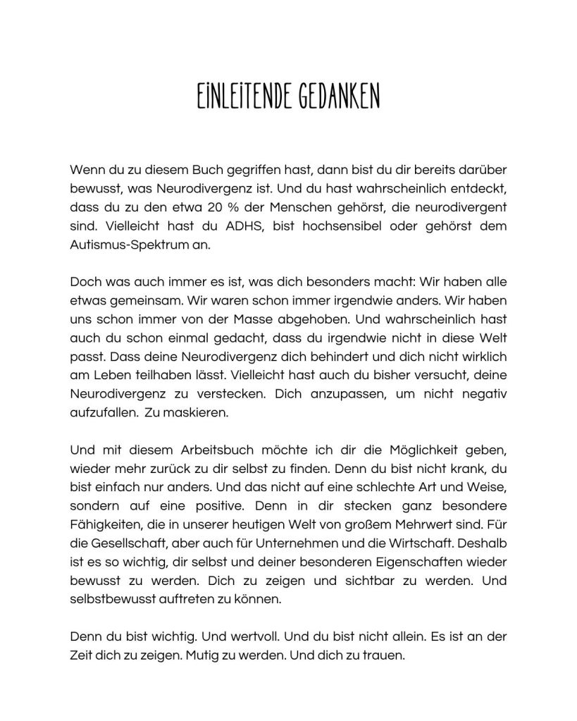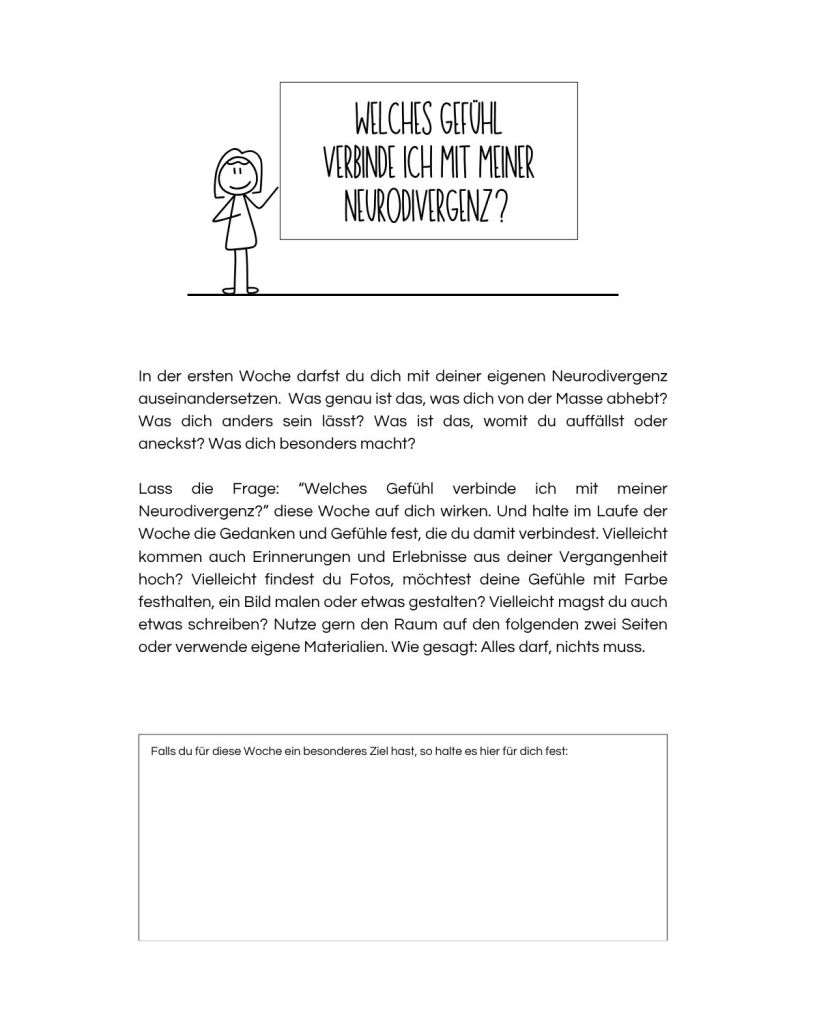 Insgesamt 10 aufeinander aufbauende Themengebiete sind liebevoll in 49 Wochenfragen bzw. Wochenaufgaben unterteilt. Du kannst sie über ein ganzes Jahr hinweg oder in deinem ganz eigenen Tempo bearbeiten. Das Ziel ist: Deine Neurodivergenz für dich anzunehmen und selbstbewusst in dein Leben zu integrieren.
